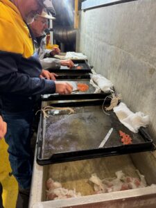 Some of our members were involved in the preparation and delivery of salmon eggs to area classrooms to be hatched and raised, and then later in March released into the Tuolumne or Stanislaus Rivers. Members John Driver and Paul Wallace aided in the gathering of eggs into cheesecloth bundles of 30 eggs each. These eggs were then delivered via volunteers to 19 area schools and 37 classrooms. Members making deliveries were John, Bob Bullock, Janice Rinehart and Mike Hewitt. Meeting in Snelling early Thursday morning, drivers were given strict instructions on the handling of the eggs and procedures for depositing them into the classroom aquariums. Egg bundles were distributed to the drivers and placed into ice chests on layers of river water-wet paper towels over bags of ice to keep them wet and cool, and then were transported to the assigned schools and classes. Several SFF members will be participating in at least one salmon release day this spring by providing fly casting demonstrations to the students releasing the salmon fry. Brief video links below showing egg bundling and classroom delivery.